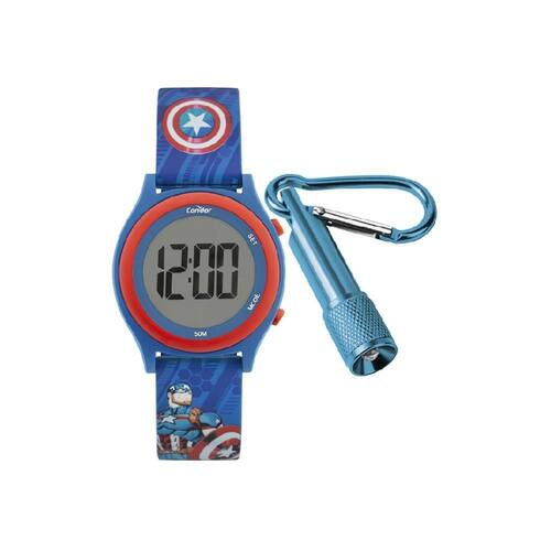 Relógio Condor Masculino Ref: Cobj3572ae/k8a Infantil Capitão America DESCRIÇÃO DO PRODUTO: Caixa de Resina Azul com detalhes em Vermelho Pulseira de Silicone Azul Estampada com personagem Capitão América Fundo de Parafusado Diâmetro / Largura da Caixa: 36.00 MM Funções: Digital, Calendário Resistente à água 5 ATM Alimentação do Maquinário: Bateria Maquina Japonesa Mostrador Azul com detalhes em branco Linha: Condor Kids + Lanterna Produto Oficial Licenciado Marvel Classificação Indicativa: A partir de 4 Anos de Idade de 1 Ano