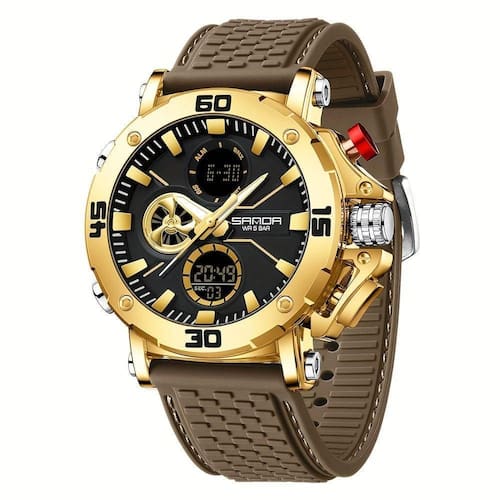 Este relógio impressiona não só pela sua tecnologia, mas também pelo seu visual marcante. A caixa de liga de , à prova d'água, protege o relógio, enquanto a pulseira de silicone marrom com detalhes dourados adiciona um toque de distinção. Ideal para encontros de negócios ou momentos casuais, ele é o presente perfeito para quem você realmente quer impressionar.