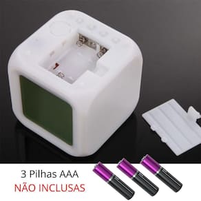Relógio moderno em formato de cubo, com display LED colorido que muda automaticamente de cor, podendo ser desligado conforme sua preferência. Além de marcar a hora, exibe a data, o dia da semana e a temperatura, funcionando também como luminária ambiente. Suporta formatos de hora 12H ou 24H.