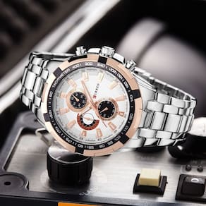Relógio de esportes da moda todo o relógio impermeável do aço 1) Largura de superfície: 4,65 cm 2) Verão: 22 cm (ajustável) 3) Peso: 160 g. 4) Material: fita de aço inoxidável Características: Antiimpacto, impermeável Especificação: Marca: Curren. Esportes: movimento de quartzo Material de banda: aço inoxidável Comprimento: 22cm. Largura da banda: 2.0cm Diâmetro de caso é de cerca de 4,6cm A espessura do caso é aproximadamente: 1.1cm Relógio Peso: 161G