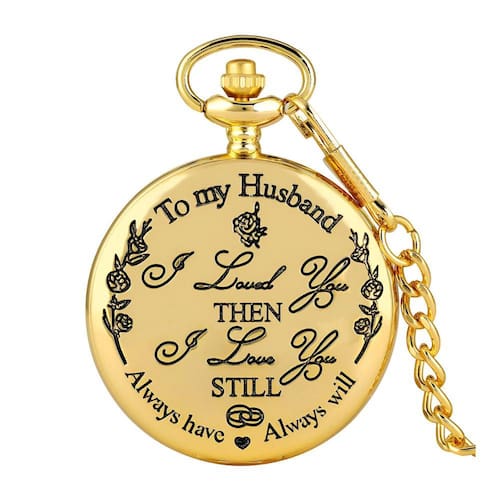 Possui gravação no relógio: TO MY HUSBAND "Para meu marido" I loved you THEN I love you Still "Eu te amei ENTÃO te amo AINDA" Always Have "Sempre tem" Always Will "Sempre vai"