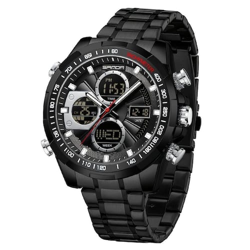 Este relógio esportivo masculino combina estilo e funcionalidade em um design sofisticado e resistente. Com uma caixa em liga de zinco e pulseira em aço inoxidável, oferece durabilidade e elegância para o uso diário em ambientes esportivos ou empresariais. O mostrador duplo aprimora seu apelo visual e permite fácil leitura do horário, enquanto a resistência à água de 5 ATM garante desempenho confiável em diversas condições.