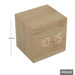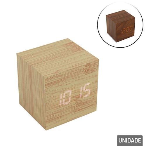 Relógio de Mesa Digital 6,5cm Madeira Desper Adicione um toque de sofisticação e modernidade ao seu ambiente com o Relógio de Mesa Digital com Despertador, com o formato de cubo de 6,5cm, que combina tecnologia e elegância em um design minimalista de madeira. Com visor em LED, ele exibe as horas com alta visibilidade e conta com funções adicionais para tornar o seu dia a dia mais prático. Ideal para quartos, escritórios, salas de estar ou qualquer espaço que precisa de um toque de estilo e funcionalidade. Exibição clara e brilhante das horas, mesmo em ambientes com pouca iluminação. Conta com alarme programável para ajudar a manter a rotina organizada. Além das horas, pode mostrar a temperatura ambiente, tornando-se ainda mais útil no dia a dia. Pode ser utilizado com cabo USB ou pilhas, oferecendo flexibilidade para diferentes necessidades. Interface intuitiva e prática para ajustes rápidos de hora, alarme e brilho.\nUtiliza: 3x Pilhas AAA (Não Inclusas). Acompanha cabo USB. Informação Adicional Marca : TINGS Tipo de material : Componentes Eletrônicos, Plástico Cores ou Estampa : Color Dimensões do Produto : 6,5 X 6,5 X 6,5 CM Dimensões da Embalagem : 9 X 7,5 X 7,5 CM Peso Bruto (Gramas) : 0.142