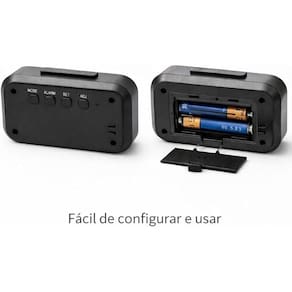 Com display LCD completo: mostra hora, data, dia da semana e temperatura ambiente. Despertador integrado: ideal para rotina diária e uso noturno. Fácil de usar: botões simples para ajuste de hora e alarme.