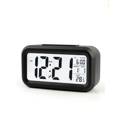 Relógio de Mesa Digital Portátil Preto Relógio portátil de mesa digital. Funções: despertador, hora, temperatura, data, iluminação noturna. Possui um sensor que detecta escuridão e liga automaticamente a luz para poder enxergar os números no escuro. Cor: preto. Medidas: comprimento 13cm x altura 7cm x profundidade 4,6cm. Funciona com 3 pilhas AAA. Marca: Foxhome Ean: 7895140712530