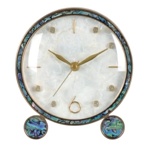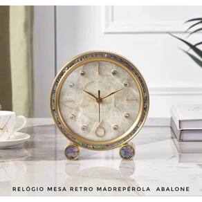 Relógio de Mesa Redondo Retro Detalhes Madrepérola Abalone e Metálico 16x7x8.5cm
