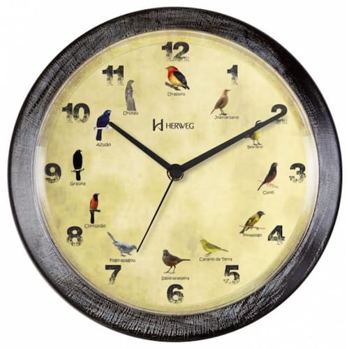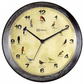 Relógio de Parede - 6658 Estilo: Decorativo Medidas: 26x26x4 cm Características Técnicas: Toque de hora cheia com melodia musical Sem toque de hora no período da noite Mecanismo Sweep sem tic-tac Usa 3 pilhas AA não inclusas Canto dos Pássaros Cores Disponíveis: Wood White Mais Informações sobre o produto Relógio de parede Base de Plástico Pintado Visor de acrílico Botões de regulagem na parte traseira do produto Toque na hora cheia com o canto dos pássaros Brasileiros Pássaros Brasileiros: - Uirapuru - João de Barro - Bem-te-vi - Curió - Pintassilgo - Canário da Terra - Sabiá Laranjeira - Fogo Apagou - Corrupião - Grauna - Azulão - Urutau - Silencia automaticamente das 22:00 às 5:00