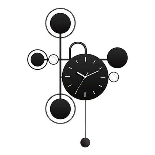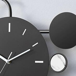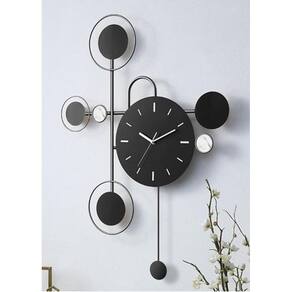 Sua estrutura tem formato superdimensional, em metal preto, com 2 detalhes espelhados, relógio central também em fundo preto, com números branco. Uma peça decorativa de fino acabamento e requinte. O design geral apresenta um desenho geométrico que exibe totalmente uma aparência bonita e elegante.