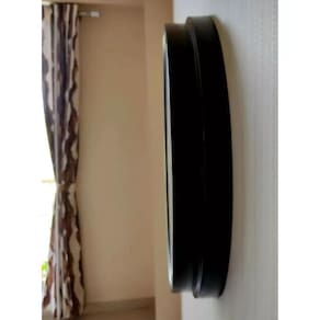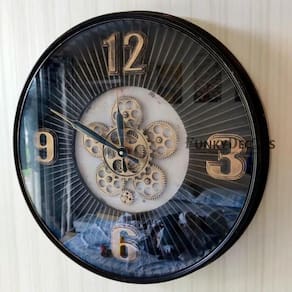 Muito elegante, arte em círculo em metal na cor preto, visor em vidro, com fundo com uma engrenagem em dourado que funciona simétricamente aos ponteiros, também dourados, tornando a peça criativa e chique.