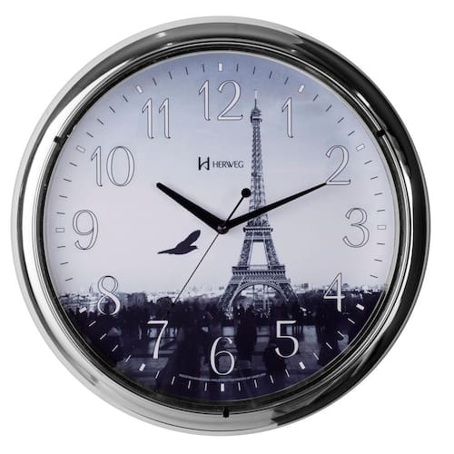 Relógio de Parede 40cm Contínuo Silencioso Cromado Herweg 660057S-028 Estilo: Decorativo Medidas: 40 cm diâmetro x 5 cm de espessura. Características Técnicas: Usa 1 pilha AA pequena comum. Produto de fabricação Nacional Herweg Máquina Silenciosa Contínua sem tic-tac. Cores Disponíveis: Número 028 - Cromado Material: Plástico metalizado cromado e vidro na frente, ponteiros em alumínio. Garantia de 1 ano. Ean: 7897280352973