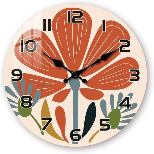 Material: Material da concha: madeira Material do espelho: Nenhum Material do mostrador: MDF Tamanho: 12 polegadas Peso: 400 g Design floral vibrante com estética moderna, com flores grandes e ousadas em cores quentes e frias, perfeitas para iluminar qualquer ambiente. O movimento silencioso de quartzo sem tique-taque garante uma operação silenciosa, ideal para quartos, salas de estar ou cozinhas onde a paz é desejada. Feito de material MDF durável, este relógio é leve, elegante e construído para durar, complementando qualquer design de interiores. Os números em negrito e os ponteiros claros facilitam a leitura, enquanto o estilo artístico adiciona um toque decorativo ao seu espaço. Operado por bateria (AA), fácil de pendurar, com diâmetro de 12 polegadas que se encaixa perfeitamente em qualquer casa ou escritório.