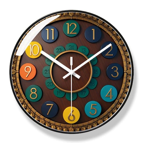 Material: Material da concha: plástico Material do espelho: vidro Material do mostrador: PVC Tamanho: 30 × 30 cm Peso: 1220 g Design vintage e criativo: este relógio de parede de 12" apresenta um design vintage inspirado na madeira com números ousados e coloridos, criando uma peça única e artística para qualquer ambiente. Silencioso e sem tique-taque: o movimento silencioso de quartzo sem tique-taque garante um ambiente silencioso, tornando-o perfeito para salas de estar, quartos ou escritórios onde a paz é fundamental. Números em negrito fáceis de ler: números grandes e coloridos se destacam claramente contra o fundo escuro, oferecendo fácil legibilidade à distância, ideais para crianças e adultos. Durável e leve: construído com uma caixa de plástico de alta qualidade, superfície espelhada de vidro e mostrador de PVC, este relógio foi construído para uso duradouro, permanecendo leve. Perfeito para decoração de casa ou escritório: com sua mistura de design artístico e cronometragem funcional, este relógio operado por bateria adiciona elegância e estilo a qualquer sala de estar ou escritório moderno.