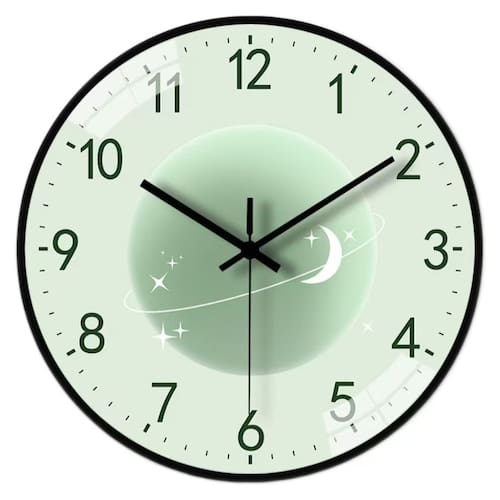 Material: Material da concha: plástico Material do espelho: espelho de vidro comum Material do mostrador: revestimento de papel Tamanho: 30 × 30 cm Peso: 630 g Design exclusivo do planeta: apresenta uma ilustração artística do planeta e da lua com estrelas cintilantes, perfeita para uma aparência moderna e celestial. Silencioso e sem tique-taque: desfrute de um ambiente tranquilo e pacífico com um movimento de quartzo antiaderente, ideal para quartos ou espaços de trabalho. Materiais de alta qualidade: feitos com caixa de plástico, espelho de vidro e mostrador de filme de papel, garantindo durabilidade e elegância. Números fáceis de ler: números claros e em negrito sobre o fundo verde suave facilitam a contagem das horas em um piscar de olhos. Uso versátil: este design atraente é perfeito para salas de estar, quartos, escritórios ou como peça decorativa.