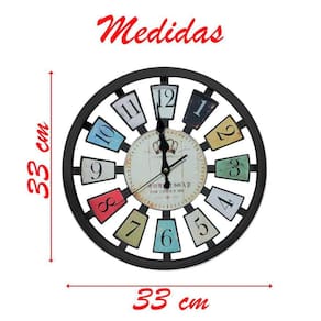 Ficha técnica. - Tipo: Máquina Quartz; - Material do relógio: em Plástico ABS + tampa de vidro - Alimentação: (01) Pilha AA (Não acompanha o produto). - Tamanho: 33 cm de Diâmetro