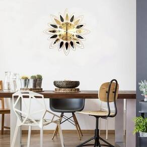 Sua estrutura tem formato de ula linda flor, com folhas espelhadas douradas e fumê , relógio central em fundo também dourado, com números preto. Uma peça decorativa de fino acabamento e requinte