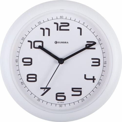 Relogio De Parede Eurora Branco Com Mostrador Branco Descrição Relógio de Parede Estilo: Moderno Medidas: 24x24x3 cm Características Técnicas: Usa pilha AA Mecanismo Tic Tac Base em Plástico Injetado Visor de Acrílico Botões de regulagem na parte traseira do produto Usa 1 pilha AA 1,5V Marca: Não Informado