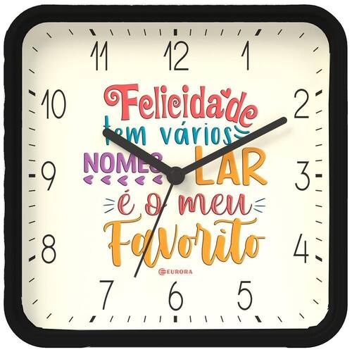 Relógio De Parede Eurora Ref: 6596-034 Preto Quadrado Lar DESCRIÇÃO DO PRODUTO: Medidas: 22A x 22 L 3,2E cm Características Técnicas: Usa pilha AA Mecanismo Step Tic-Tac Produto Nacional Informações sobre o produto: Relógio de parede Base em Plástico Injetado Botões de regulagem na parte traseira do produto Cor da Base: Preto Cor do Mostrador: bege com inscrição Felicidade tem vários nomes Lar é o meu favorito e números em preto Para a decoração do seu lar de 1 ano Marca: Não Informado
