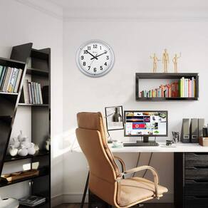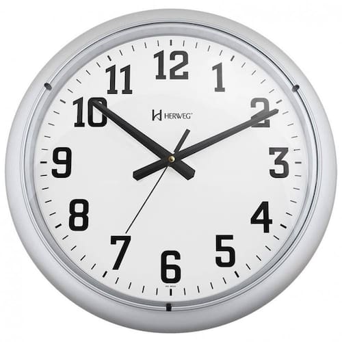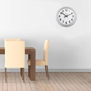 Base em plástico injetado pintado Visor de acrílico Botões de regulagem na parte traseira do produto Usa pilha aa Mecanismo step Cor: prata metálico Medidas: diâmetro: 40 cm e profundidade: 5 cm.