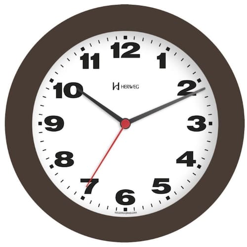 Relógio De Parede Herweg Ref: 6103-304 Marrom Chocolate DESCRIÇÃO DO PRODUTO: Medidas: 21D x 3E cm Características Técnicas: Usa pilha AA Mecanismo Step Tic-Tac Produto Nacional Informações sobre o produto: Relógio de parede Base em Plástico Injetado Botões de regulagem na parte traseira do produto Cor da Base: Marrom Chocolate Cor do Mostrador: Branco com números de 1 ano Marca: Não Informado Ean: 7897280333835
