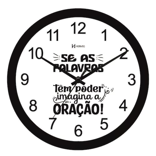 Relógio de parede herweg ref: 660147-034 preto oração Descrição do produto: Medidas: 22d x 3,4e cm Características técnicas: Usa pilha aa Mecanismo step tic-tac Produto nacional Informações sobre o produto: Relógio de parede Base em plástico injetado Botões de regulagem na parte traseira do produto Cor da base: preto Cor do mostrador: branco com todos os números e frase se as palavras tem poder imagina a oração Tema: religioso Ideal para a decoração de ambientes de 1 ano Marca: Não Informado