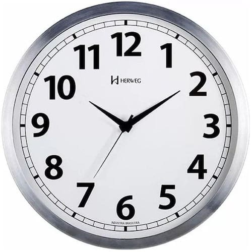 Relógio Parede Step Base Alumínio Escovado ( Original Herweg )- Estilo: Moderno- Medidas: 24,5D x 4E cm- Base em Amlumínio Escovado- Visor de Vidro- Botões de regulagem na parte traseira do produto- Usa 1 pilha AA 1,5V que não acompanha o produto Usa pilha AA Mecanismo Step (Faz Tic-Tac) Este produto acompanha:- Manual em Português- Nota Fiscal- Embalagem- Garantia de 12 meses do Fabricante Ean: 7897280342936