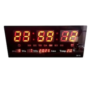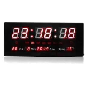 Características do produto: Nitidez excelente Moldura metálica na mesma cor do relógio Cor dos Ledes: Vermelho Tensão da fonte: 110v / 220v (Bivolt) Possui fácil ajuste, através dos botões na parte inferior traseira Marca a hora/minutos/segundos, dia do mês/mês/ano, dia da semana, temperatura Hora: 12/24h Sistema eletrônico de quartz Não perde a memória quando acaba energia Por ter o seu visor de led torna a visibilidade no escuro nítida Cor do Relógio: Preto Dimensões aproximadas do produto: - Comprimento: 36 cm - Altura: 15 cm - Largura: 3 cm Itens Inclusos: 1 Relógio com visor de led 1 Fonte de energia (bivolt)