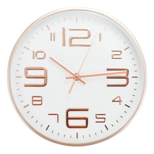 Relógio de parede redondo de 24,5 x 24,5 cm de dimensão com 4,5 cm de profundidade. Borda, numeração e ponteiros cor rosê ou cinza escuro, com fundo branco, . Ponteiros para horas, minutos e segundos. Numeração arábica. Material: plástico; Funcionamento: 1 pilha AA Informação Adicional Código GD-9855K1-M(ROSE) Peso (Kg) 0.40 Altura (cm) 24.50 Largura (cm) 24.50 Comprimento (cm) 4.50 Certificado Não se aplica