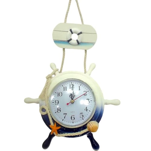 Detalhes Material: Resina Dimensões:diâmetro relógio 10,5 cm Cor:azul e branco com detalhes náuticos Estilo:temático marítimo Altura Total : 35 cm Funcionamento: 1 Pilha AA pilha inclusa Marca: Não Informado Ean: 7795855326353