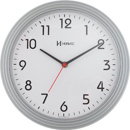 Relógio De Parede Prata Metálico 28Cm Herweg 6633-070 Tamanho: 28cm de diâmetro X 3cm de espessura Maquinário: Step Tic-tac Cor do fundo: Branco Cor da Estrutura: Prata Metálico Base: Plástico pintado Vidro: Acrílico Usa pilha AA Fabricado por HERWEG RELÓGIOS com de 1 Ano