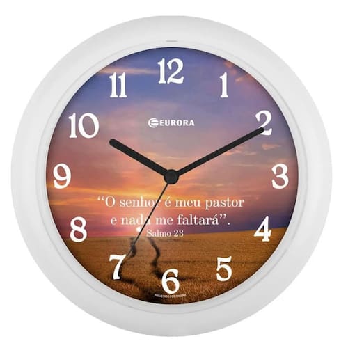 Descrição Relógio De Parede Eurora Ref: 655800-021 Branco Salmo 23 DESCRIÇÃO DO PRODUTO: Medidas: 24,5D x 3,3E cm Características Técnicas: Usa pilha AA Mecanismo Step (Tic-Tac) Produto Nacional Informações sobre o produto: Relógio de parede Base em Plástico Injetado