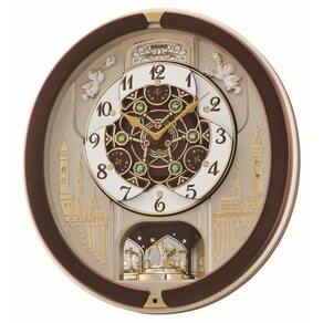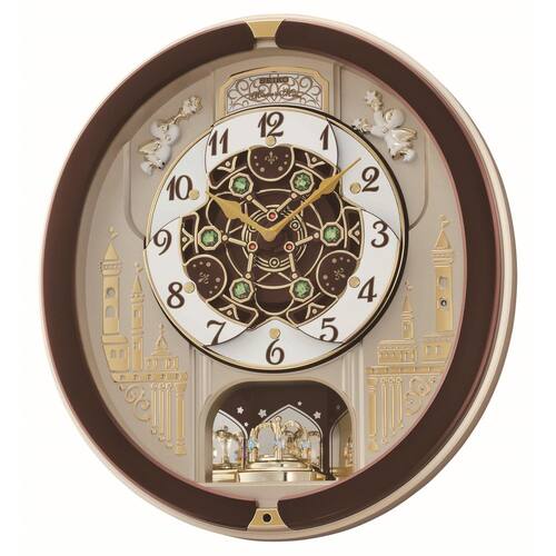 Seiko Relógio de parede musical Melodies in Motion, dança da primavera - Na hora, o relógio toca uma das 18 melodias; o controle de volume permite que você selecione o nível de som certo - Possui um horizonte dourado com cristais Swarovski verdes vibrantes, com mostrador que abre e gira uma roda decorativa a cada hora - Perfeito para qualquer sala com sensor de luz que desliga todas as melodias quando escurece - O movimento de cristal de quartzo permite a hora mais precisa - Uma elegante caixa marrom metálica e fechado em vidro, este relógio iluminará sua casa o ano todo; tamanho 44 cm C x 40 cm L; alimentado por baterias 4C (incluídas)