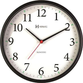 Relógio de parede silencioso redondo preto 26 cm herweg 6126s-34 Estilo moderno decorativoBase em plástico injetadoIluminação noturna com fosforescênciaA iluminação deste produto é através de massa luminosa no mostradorMecanismo sweep - silenciosoProduto nacionalUsa pilha aa(não inclusas)Cor:preto Medidas:Diâmetro de 26 cmEspessura de 4 cm AcompanhaManualCertificado de garantia herweg: 12 meses