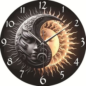 Material: Material da concha: madeira Material do espelho: MDF Material do mostrador: MDF Tamanho: 12 polegadas Peso: 495 g O design deslumbrante do sol e da lua cria uma atmosfera celestial única, perfeita para decoração moderna ou gótica. Movimento de quartzo silencioso e antiaderente para um ambiente tranquilo e silencioso em qualquer ambiente. Tamanho de 12 polegadas com números em negrito e fáceis de ler, ideal para salas de estar, quartos ou escritórios. Material MDF durável com acabamento suave e arte celestial vibrante. Funciona com bateria para configuração sem complicações e desempenho duradouro.