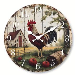 Material: Material da concha: madeira Material do espelho: Nenhum Material do mostrador: MDF Tamanho: 12 polegadas Peso: 560 g Design inspirado em uma fazenda: com uma cena encantadora de galo e celeiro com tomates vibrantes, este relógio traz uma sensação rústica e campestre a qualquer espaço. Silencioso e sem tique-taque: o relógio funciona silenciosamente, tornando-o ideal para quartos, cozinhas ou salas de estar onde você precisa de um ambiente tranquilo. Materiais de alta qualidade: feito de MDF durável, este relógio combina charme rústico com durabilidade, garantindo que dure por muitos anos. Números fáceis de ler: os números grandes e em negrito no mostrador do relógio facilitam a contagem das horas, enquanto o design inspirado na fazenda adiciona personalidade à decoração da sua casa. Decoração versátil: com 30 cm (12”), este relógio de parede se encaixa perfeitamente em cozinhas em estilo de fazenda, salas de estar aconchegantes ou escritórios, oferecendo um toque elegante e funcional ao seu espaço.