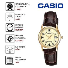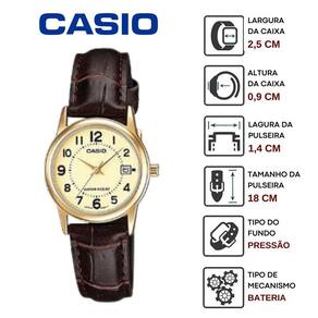 Relógio Casio Feminino Analógico Social Dourado LTP-V002GL-9BUDFEste relógio Casio feminino é perfeito para mulheres que buscam sofisticação e estilo em seu visual social. Com sua caixa dourada e pulseira em couro, ele transmite elegância e glamour. Além disso, o vidro mineral proporciona maior resistência a arranhões, garantindo uma aparência sempre nova.Este relógio Casio feminino é o acessório perfeito para mulheres que valorizam a qualidade, o estilo e a funcionalidade em um único item. Não deixe de ter esse charme dourado em seu pulso e desfrute de um relógio confiável e elegante em qualquer ocasião.RecursosResistente a águaExibição de dataPulseira em couroDesign simples e fácil de usarEspecificações:Corpo/anel: DouradoPulseira em CouroVidro mineralResistente a águaHorário regularAnalógico: 3 ponteiros (hora, minuto, segundo)Precisão: ±20 segundos por mêsDuração aprox. da bateria: 3 anos com SR626SW Medidas:Diâmetro da caixa: 3,1x2,5cmEspessura da caixa: 0,9cmLargura da pulseira: 1,4cmTamanho da pulseira: 18cmPeso do relógio: 24g Conteúdo da Embalagem:Estojo da MarcaAcessórios da Marca (correspondentes a cada modelo)Manual em PortuguêsCertificado de 01 ano junto ao FabricanteNota Fiscal Eletrônica Fornecedor: Casio Brasil Comércio Produtos Eletrônicos Ltda. CNPJ:10.172.255/0001-95 Ean: 4971850083122