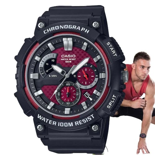 Seja ousado e esportivo com um relógio analógico com cronógrafo retrógrado. Resistente à água até 100 metros, cronômetro e outras funções úteis e confiáveis ??mantêm você no caminho certo o dia todo.