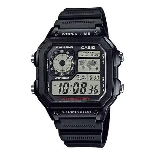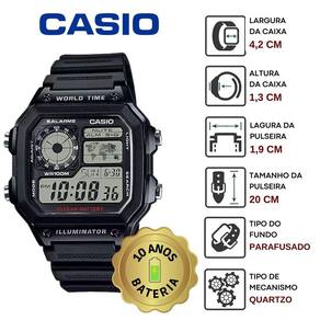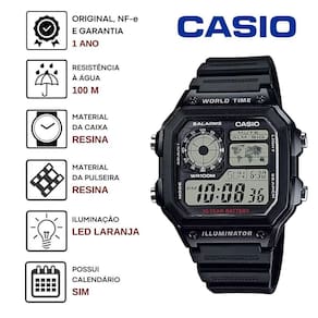Relógio de Pulso Casio Masculino Digital Preto AE-1200WH-1AVDF Apresentamos o Relógio Esportivo de Alta Durabilidade! Resistente à água até 100 metros, possui moldura e pulseira em resina, assegurando sua durabilidade. Com recursos avançados como cronômetro de 1/100 de segundo, temporizador e cinco alarmes, é perfeito para esportistas. Com 31 fusos horários mundiais e calendário automático completo, mantenha-se no tempo onde quer que esteja. Sua luz LED laranja proporciona visibilidade em qualquer condição, e a duração da luminosidade é ajustável. Prepare-se para suas aventuras com o Relógio Esportivo de Alta Durabilidade!Especificações:Material da moldura/caixa: ResinaVidro com resinaPulseira em resinaResistente à água a até 100 metrosDuração aproximada da pilha: 10 anos em CR2025 Recursos:Horas variadas (4 cidades diferentes)31 fusos horários mundiais (48 cidades + tempo universal coordenado), horário de verão (liga/desliga), troca de cidade de referência/hora mundialCronômetro de 1/100 de segundoCapacidade de medição: 23:5959,99Modos de medição: tempo decorrido, tempo parcial, tempos do 1º e 2º lugarescontagem regressivaTemporizadorUnidade de medição: 1/10 de segundoFaixa de entrada: 1 segundo a 24 horas (incrementos de 1 segundo, incrementos de 1 minuto e 1 hora)Cinco alarmes únicos ou diáriosSinalização a cada horaLuz de LED cor: LaranjaDuração de luminosidade selecionável, fosforescênciaCalendário automático completo (até o ano de 2099)Recurso Mudo: Ativação e desativação do Som de operação dos botõesPrecisão: ±30 segundos por mêsFormatos de 12/24 horasModo de indicação das horas regular: hora, minuto, segundo, pm, mês, data, dia Medidas:Diâmetro da caixa: 4,5x4,2cmEspessura da caixa: 1,3cmLargura da pulseira: 18cmTamanho da pulseira: 22cm Peso do relógio: 39g Conteúdo da Embalagem:Estojo da marcaAcessórios (correspondentes a cada modelo)Manual em PortuguêsCertificado de 01 ano junto ao FabricanteNota Fiscal Eletrônica