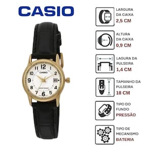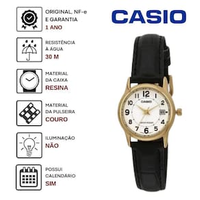 Relógio Casio Feminino Analógico Social Dourado LTP-V002GLEste relógio Casio feminino é perfeito para mulheres que buscam sofisticação e estilo em seu visual social. Com sua caixa dourada e pulseira em couro, ele transmite elegância e glamour. Além disso, o vidro mineral proporciona maior resistência a arranhões, garantindo uma aparência sempre nova.Com recursos funcionais como resistência à água e exibição de data, você terá um relógio prático e versátil para o dia a dia. Seu design simples e fácil de usar torna a leitura das horas rápida e intuitiva.A precisão do movimento analógico de 3 ponteiros, que indicam hora, minuto e segundo, é garantida pela qualidade dos relógios Casio. A duração aproximada da bateria é de 3 anos, o que torna este relógio prático e de baixa manutenção.Este relógio Casio feminino é o acessório perfeito para mulheres que valorizam a qualidade, o estilo e a funcionalidade em um único item. Não deixe de ter esse charme dourado em seu pulso e desfrute de um relógio confiável e elegante em qualquer ocasião.Recursos:Resistente a águaExibição de dataPulseira em couroDesign simples e fácil de usarEspecificações:Corpo/anel: DouradoPulseira em CouroVidro mineralEstojo dourado com galvanização por íonsHorário regularAnalógico: 3 ponteiros (hora, minuto, segundo)Precisão: ±20 segundos por mêsDuração aprox. da bateria: 3 anos com SR626SWMedidas:Diâmetro da caixa: 3,1x2,5cmEspessura da caixa: 0,9cmLargura da pulseira: 1,4cmTamanho da pulseira: 18cmPeso do relógio: 24gConteúdo da Embalagem:Estojo da MarcaAcessórios (correspondentes a cada modelo)Manual em PortuguêsCertificado de 01 ano Junto ao FabricanteNota Fiscal Eletrônica Ean: 4971850083115