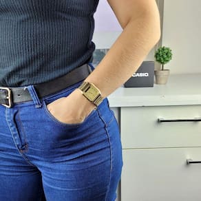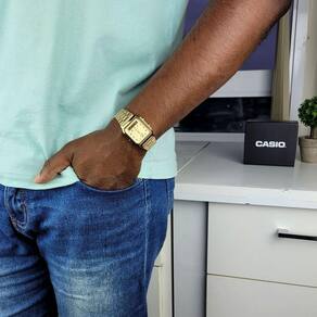 Especificações: Material da caixa: Resina / Dourado Fecho ajustável Pulseira de Aço Inoxidável Vidro com resina Resistente a água Atenção: Este modelo é 3ATM/30 metros (resistentes à água). Os relógios com estas características são resistentes ao contato acidental com àgua (respingos de água, chuva, lavar as mãos, tarefas domésticas...), mas não aceita pressões. Hora dupla Cronônetros de 1/100 de segundo Capacidade de medição: 5959.99" Modo de medição: tempo transcorrido Alarme diário Sinalização a cada hora Calendário automático (fevereiro com 28 dias) Formatos de 12/24 horas Horário regular Analógico: 2 ponteiros (hora, minuto) Digitais: hora, minutos, segundos, am/pm (pós-meridiano), mês, data, dia Precisão: ±30 segundos por mês Aprox. da bateria: 3 anos com SR920W