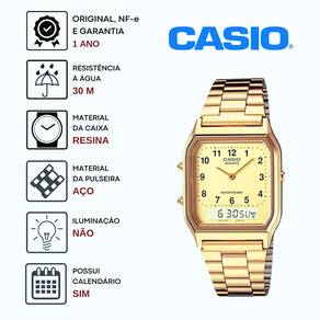 O Relógio Casio Unissex Anadigi Vintage Causal Dourado AQ-230GA é um relógio com recursos interessantes, como hora dual, cronômetro de 1/100 segundo e visor de data e hora na posição 6 horas. Ele tem uma caixa de resina dourada e uma pulseira de aço inoxidável com fecho ajustável. O vidro do relógio é feito de resina e é resistente à água, mas apenas até uma profundidade de 30 metros. O relógio também possui um alarme diário e sinalização a cada hora, bem como um calendário automático que leva em conta o mês de fevereiro com 28 dias. Ele pode ser configurado para exibir o horário em formato de 12 ou 24 horas, e tem uma precisão de ±30 segundos por mês. A bateria do relógio tem uma vida útil aproximada de 3 anos com a bateria modelo SR920W.