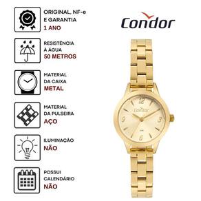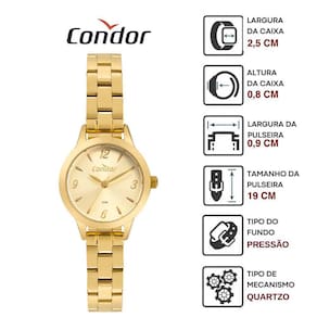 Marca: Condor Modelo: CO2035MZQ/4X Tipo de mostrador: Analógico Mecanismo: Quartzo Alimentação: Bateria Formato da Caixa: Redondo Cor do mostrador: Dourado com ponteiros e Index Dourados Cor da caixa: Dourado Cor da pulseira: Dourado Material do Vidro: Cristal Mineral Material da caixa: Metal Material da pulseira: Aço Inox Tipo de Fecho: Dobrável com 2 Botões Nível de Resistência à Água: 50 Metros Calendário: Não Cronômetro: Não Alarme: Não Luz noturna: Não