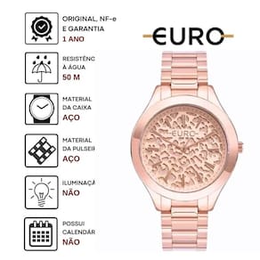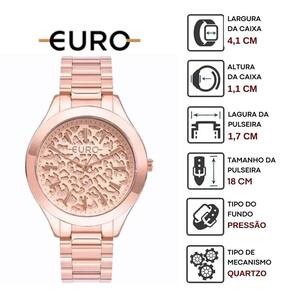 Relógio Euro Feminino Analógico Rose Gold EU2036YTW/4J Marca: EuroModelo: EU2036YTW/4JTipo de mostrador: AnalógicoMecanismo: QuartzoAlimentação: BateriaFormato da Caixa: RedondoCor do mostrador: Animal Print com Index e Ponteiros Rose GoldCor da caixa: Rose GoldCor da pulseira: Rose GoldMaterial do Vidro: Cristal MineralMaterial da caixa: MetalMaterial da pulseira: Aço InoxTipo de Fecho: DobrávelNível de Resistência à Água: 50 MetrosCalendário: NãoCronômetro: NãoAlarme: NãoLuz noturna: Não Medidas:Diâmetro da caixa: 4,1cmEspessura da caixa: 1,1cmLargura da pulseira: 1,7cmTamanho da Pulseira: 18cmPeso do relógio: 99g Conteúdo da Embalagem:Estojo da MarcarAcessórios (correspondentes a cada modelo)Manual em PortuguêsCertificado de 01 ano junto ao FabricanteNota Fiscal Eletrônica O Grupo Technos assegura o perfeito funcionamento do seu relógio pelo período de 01 ano em todo território nacional, caso o seu produto apresente algum defeito, encaminhe diretamente à assistência técnica mais próxima de sua região, sempre acompanhado da documentação recebida.