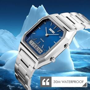 Gênero: masculino Estilo: simples, moderno, esportivo Taiwan IC Movimento Cores: ouro rosa, ouro, prata, azul, preto Material da caixa: liga de zinco Material da pulseira: aço inoxidável Tipo de fivela do mostrador: quadrado Diâmetro do mostrador: 33 mm Espessura da caixa: 11 mm Largura da pulseira: 22 mm Profundidade da pulseira: 30 ATM Funções: tela dupla, luz EL, data, cronógrafo, alarme Características: tela dupla, relógio de quartzo digital, Impermeável