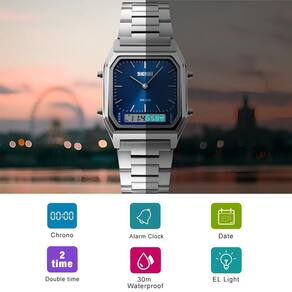 ?RELÓGIO MULTIFUNCIONAL DE AÇO INOXIDÁVEL?---- Exibição de hora dupla, cronômetro, alarme, data automática e luz EL e oferece uma experiência de uso muito confortável. A bateria japonesa fornecerá forte potência, é adequada para mulheres ou homens de qualquer idade