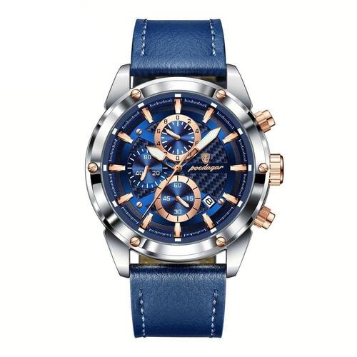 A pulseira de couro PU proporciona conforto excepcional para uso durante o dia inteiro, e sua resistência à água de 3 ATM garante proteção contra salpicos e chuva leve. Seja para reuniões de negócios ou ocasiões casuais, este relógio é um acessório indispensável para complementar qualquer look. O detalhamento do cronógrafo, o calendário e os pontos luminosos são apenas algumas das características que fazem deste relógio uma escolha inteligente e estilosa.