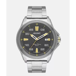 Relógio masculino com sistema analógico com ponteiros indicando as horas, minutos e segundos. Caixa em aço com vidro em cristal mineral e pino para ajuste de horas. Mostrador personalizado com calendário diário, indicadores tracejados e numerosos. Pulseira em aço trabalhado com fechamento dobrável.