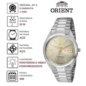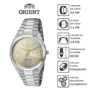 Relógio Orient Masculino Automático Analógico Prata 469WA1AFMarca: OrientTipo de mostrador: AnalógicoMecanismo: AutomáticoAlimentação: Movimento do pulsoFormato da Caixa: RedondoCor da caixa: PrataCor da pulseira: PrataMaterial do Vidro: Cristal MineralMaterial da caixa: Aço InoxMaterial da pulseira: Aço InoxTipo de Fecho: DobrávelNível de Resistência à Água: 30 MetrosCalendário DuploCronômetro: NãoAlarme: NãoLuz noturna: Ponteiros e Index FosforescentesMedidas:Diâmetro da caixa: 3,6 cmEspessura da caixa: 1,1 cmLargura da pulseira: 1,9 cmTamanho da pulseira: 20 cmPeso do relógio: 85gConteúdo da Embalagem:Estojo da MarcaAcessórios (correspondentes a cada modelo)Manual em PortuguêsCertificado de 01 ano junto ao FabricanteNota Fiscal EletrônicaO Grupo Orient assegura o perfeito funcionamento do seu relógio pelo período de 01 ano em todo território nacional, caso o seu produto apresente algum defeito, encaminhe diretamente à assistência técnica mais próxima de sua região, sempre acompanhado da documentação recebida. Ean: 7891529189726