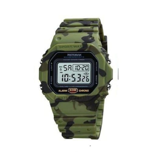 Relógio digital esportivo masculino pretorian wprt-22-gc camuflado verde Informações do produto Relógio digital esportivo masculino pretorian wprt-22-gc camuflado verde prova d'água A impermeabilidade e robustez do relógio digital da pretorian são qualidades que fazem dele ideal para esportes. Seu material em silicone e ajuste por fivela proporciona maior qualidade. Sem contar que é resistente à água até uma profundidade de 50m. Suas funções são alarme, calendário, cronômetro, luz e timer. As mais modernas funcionalidades e um design leve e elegante. Se entregue ao esporte e divirta-se. Especificações técnicas Indicado para: dia a dia Material da caixa: borracha Material da pulseira: silicone Fechamento: fivela Tipo de relógio: digital Comprimento total do relógio: 23cm Largura pulseira: 26mm Largura da caixa: 45.0mm Altura da caixa: 13.0mm Peso: 43g Funções: função: alarme, calendário, cronômetro, luz, timer Resistencia a agua: 50 atm Complemento da descrição: vídeo de acrílico, resistente a água, profundidade 50 m e Alimentação por bateria. Ocasião: prática esportiva do fabricante: contra defeitos de fabricação