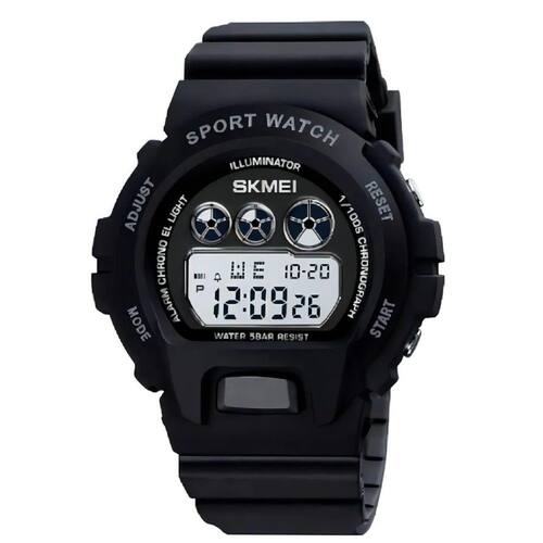 O relógio na imagem é o SKMEI 1775. É um relógio digital esportivo com as seguintes características: Design e Materiais: Possui corpo e pulseira de resina preta ou poliuretano PU , com caixa redonda de plástico ABS. A resistência à água é de 5 ATM, permitindo o uso para natação em águas rasas, mas não para mergulho. Funções: Inclui hora, data, dia da semana, alarme, cronômetro, temporizador, formato de 12/24 horas e luz de fundo LED de cor verde. Peso e Dimensões: Pesando cerca de 43 gramas, é considerado leve e confortável. O diâmetro do mostrador é de 45mm e a espessura é de 16mm. Cor da caixa: Preto. Cor do bisel: Preto. Material da correia: Resina. Cor da correia: Preto. Resistente à água. Acompanhe qualquer ocasião Marca: Não Informado