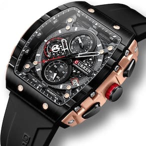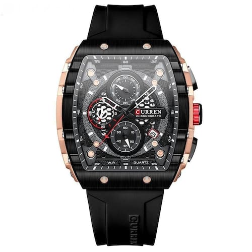 Luminoso, atuo dat, cronógrafo (1/10 segundos dial, segundos dial, dial minuto), pulseira de silicone, mostrador grande quadrado, à prova dágua 3 ATM